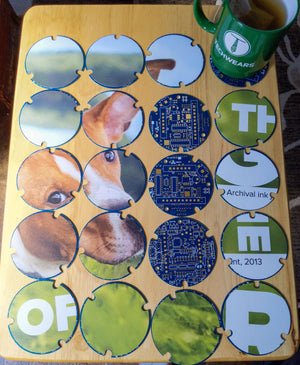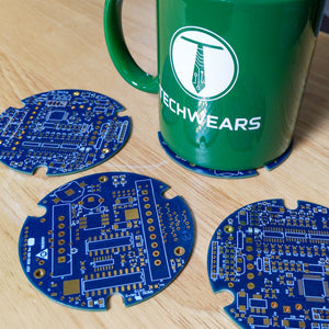 These circuit board coasters are simple, fun, and stylish! And we are especially proud of the recycled vinyl backings we invented for them. (Check out the process photos!)