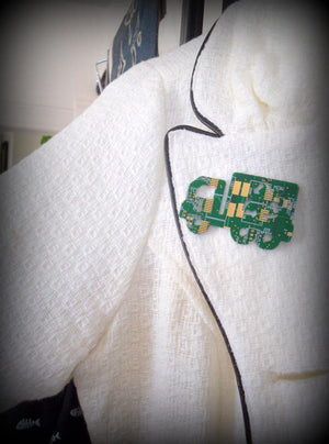 A custom order that we decided to keep around. This Circuit Board Truck Magnet has a tiny little recycle symbol carved into the side. The recycle symbol can also be left off if you wanted to put a sticker with your logo on it. Can also be easily made into a pin or ornament.