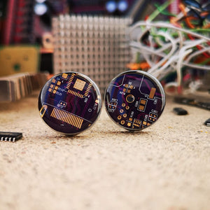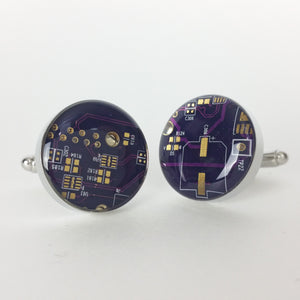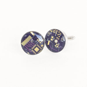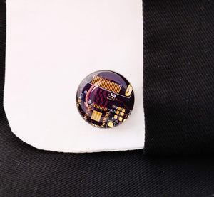 Purple and Gold Circuit Boards are pretty hard to find at the recycling centers. But we will never stop searching for them because they make such beautiful cufflinks! The beautiful color, the high quality silver plated backing, and the expertly placed jeweler's resin combines for royal beauty any Monarch would be envious of.  Available in Round or Square.