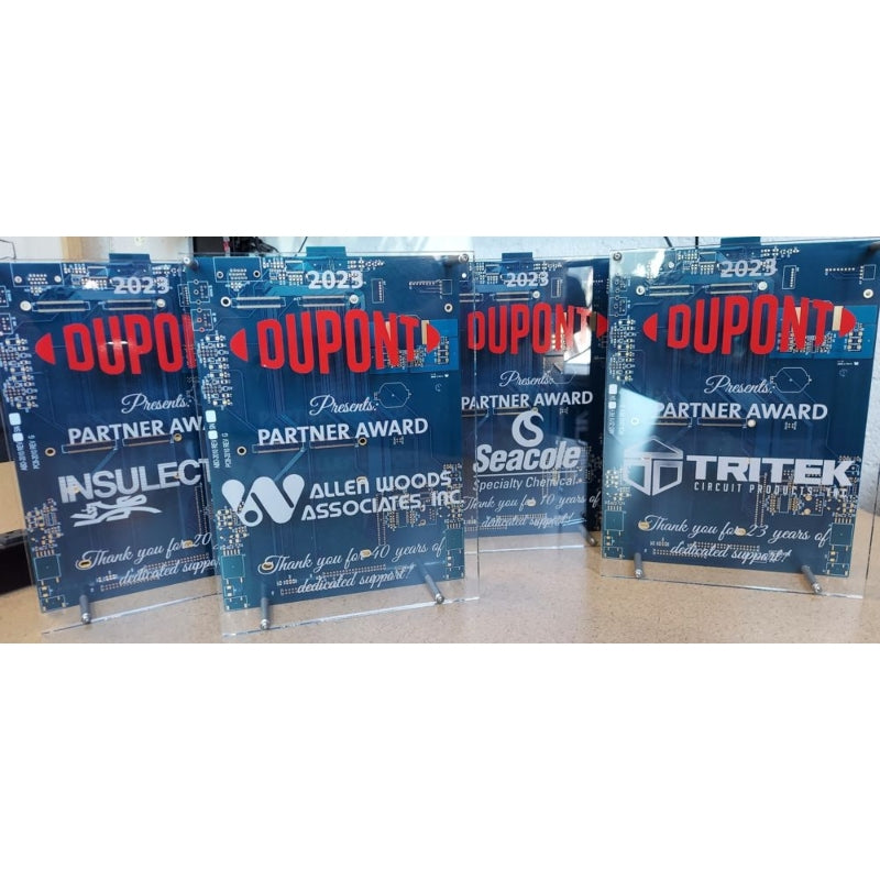 Crafted with beautiful recycled circuit boards, the Panel design simply uses the pre-consumer circuit board panels as we find them. Using existing mounting holes, standoffs are used to mount a cast acrylic surface featuring your logo, text, and event details. Creating a unique freestanding design that is ideal for organizations that want simple recognition pieces that spark conversation.