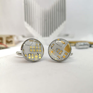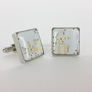 These ultra-rare white and gold circuit boards make the perfect pair of cufflinks to wear at your next white tie event. Expertly applied jeweler's resin, high-quality silver plated backing, your friends will never believe they are upcycled. Choose Round or Square.